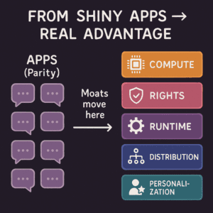 So—has OpenAI lost its way? The evidence points instead to a company repositioning for where advantage will live next. As the app layer converges on parity, OpenAI is building on the scarce layers: compute efficiency, enforceable rights and provenance, observable agent runtimes, owned distribution, and durable personalization. The problem is that they are way behind the other major tech providers and they may not be able to close the gaps that are growing ever-more-important. The next winners won’t be the ones with the prettiest chatbox—they’ll be the ones who own the scarce layers that make everyone else’s apps possible.